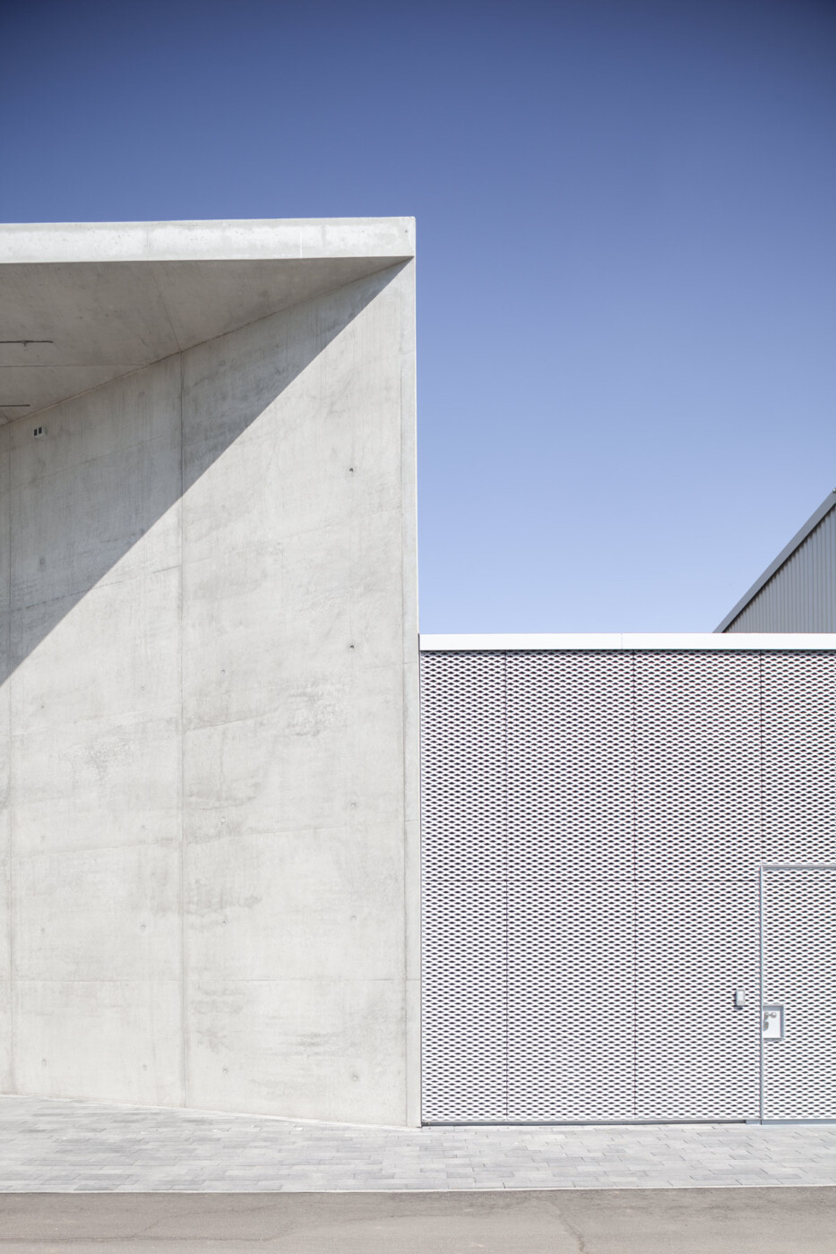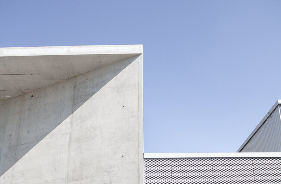Die massive Sichtbetonarchitektur fügt sich perfekt ins industrielle Umfeld ein und unterstreicht den technischen Anspruch. Highlight: Die Projektionsfassade im Süden mit integriertem Vordach schützt Technik und bietet clevere Befestigungsmöglichkeiten für Shows im Freien.