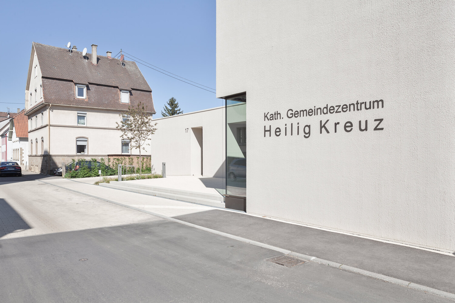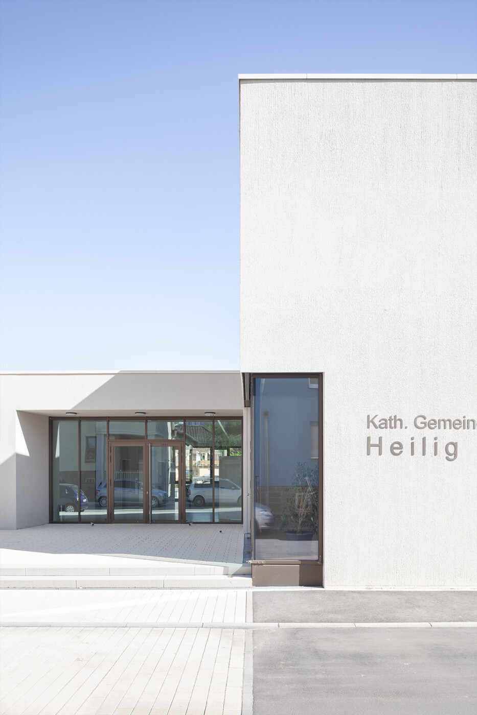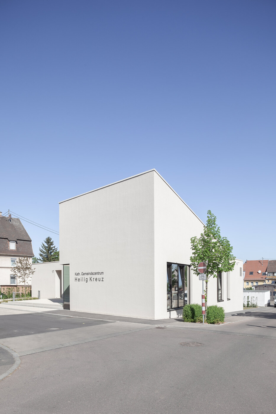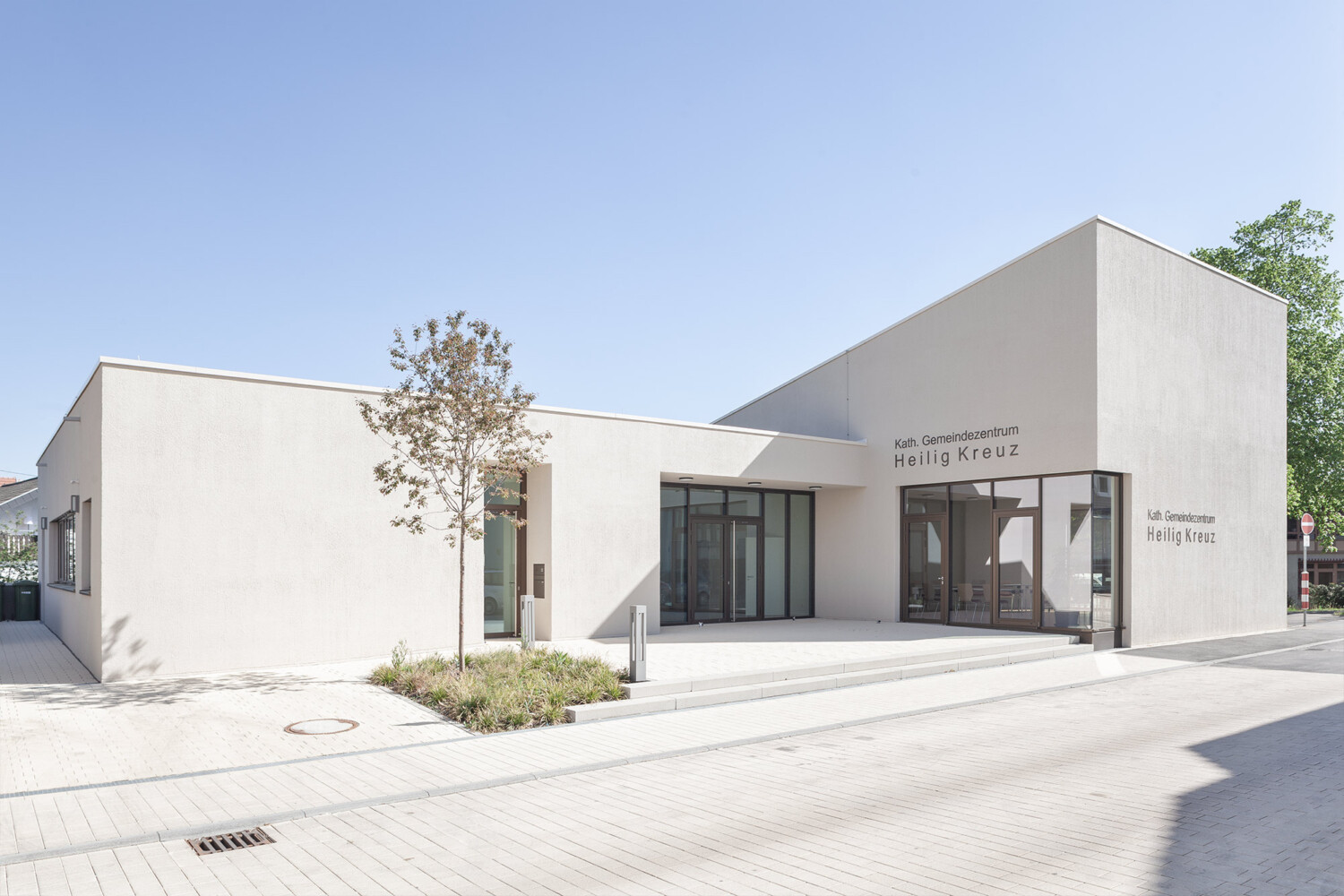 Das neue Gemeindezentrum in Bönnigheim wird von der Heilig Kreuz Kirche und dem künftigen Gemeindehaus gebildet. An einen zentralen Kirchplatz, der sich über die Straße hinweg spannt, stehen sich Kirche und Gemeindehaus diagonal gegenüber und bilden ein Ensemble. Um den skulptural geformten Gemeindesaal legt sich ein L-förmiger Flachdach, sodass der Gemeindesaal mit seinem geneigten Dach und dem krönenden „Lichtfänger“ empor ragt und Aufmerksamkeit beansprucht. Der zur Kirche gerichtete Eingang ist schlüssig im geschützten Winkel positioniert und nutzt mit einem durchgestreckten Foyer die Qualitäten des Grundstücks aus. So schließt es den grünen Garten mit seinem üppigen Baumbestand an den steinernen Kirchplatz an. Der Saal bietet über eine gezielt gesetzte Übereckverglasung einen intensiven Blickbezug zur Kirche und kann durch hinzuschalten von Foyer und Sitzungssaal sehr flexibel genutzt werden. Pfarrbereich und Gruppenräume können jeweils autark erschlossen werden. Die Fassade des Gemeindehauses greift die Putzfassaden der Nachbarhäuser und der Kirche auf und zitiert die Sandsteinsockel der Umgebung in seinem Sockelgeschoss. Das Gemeindehaus kommt auf diesem Sockel innerhalb des abfallenden Geländes zu einem sicheren Stand.