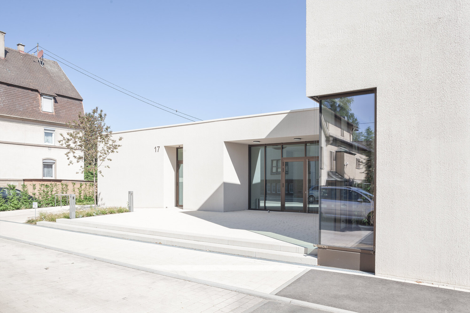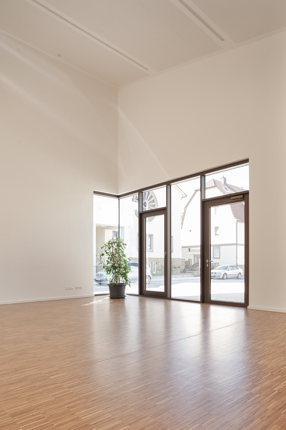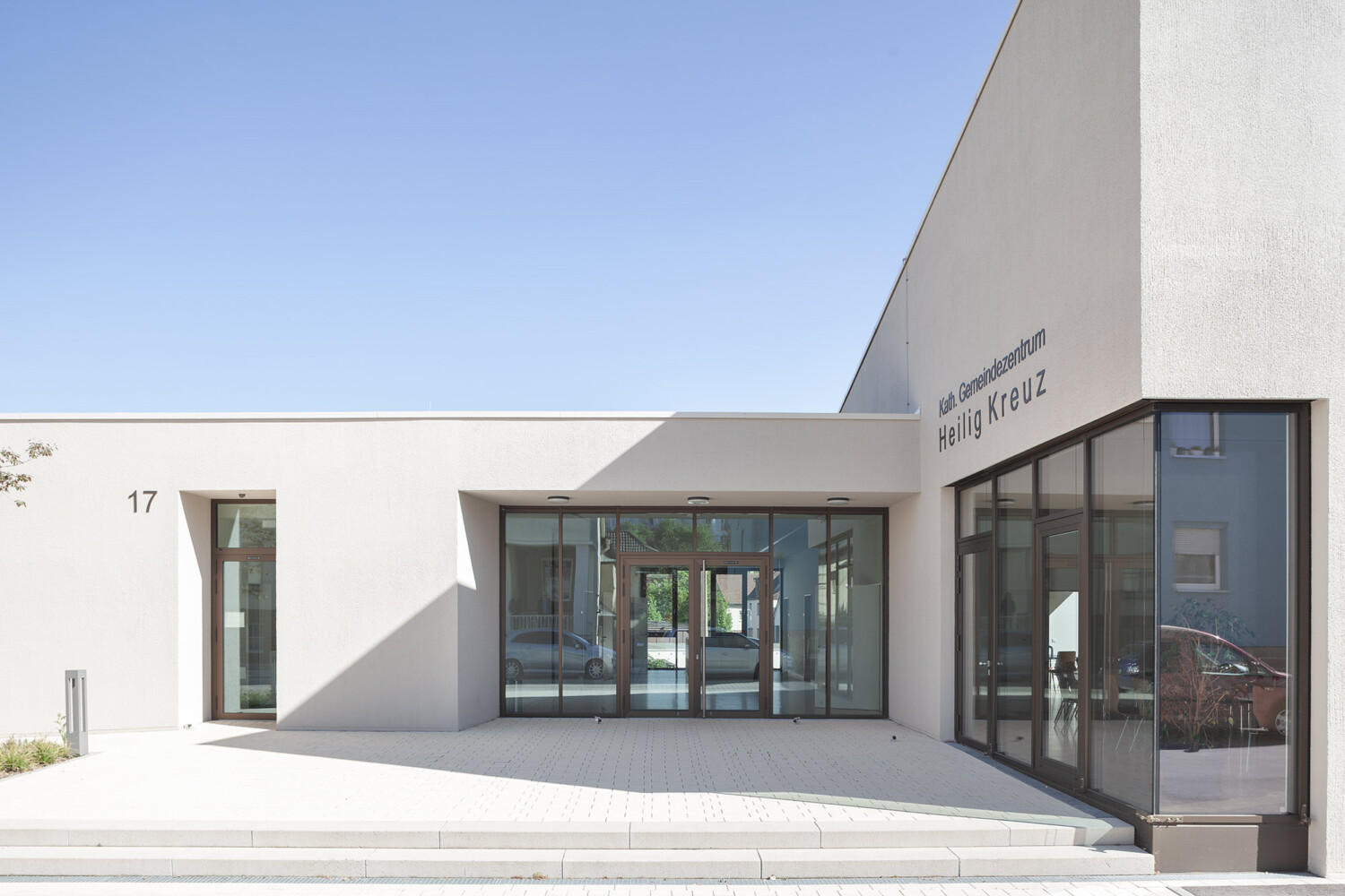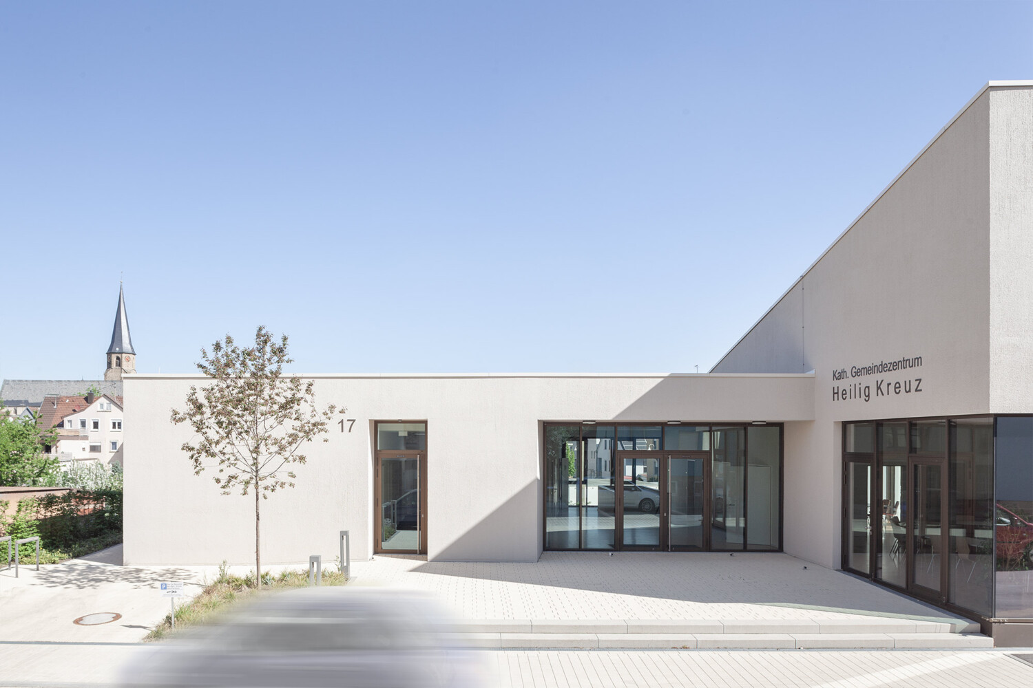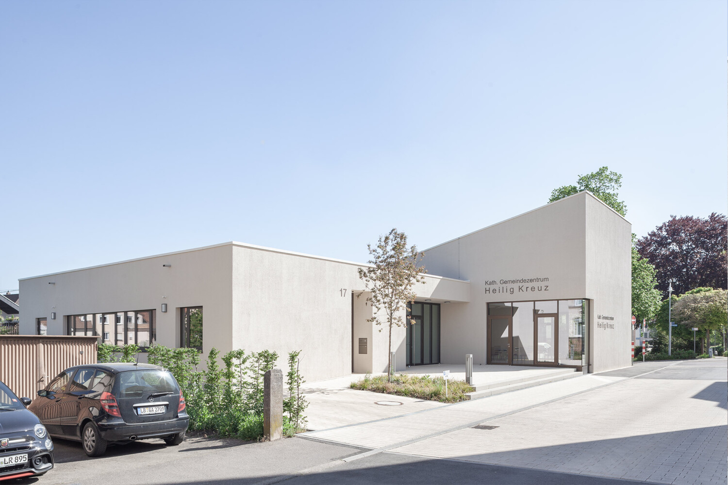 Das neue Gemeindezentrum in Bönnigheim wird von der Heilig Kreuz Kirche und dem künftigen Gemeindehaus gebildet. An einen zentralen Kirchplatz, der sich über die Straße hinweg spannt, stehen sich Kirche und Gemeindehaus diagonal gegenüber und bilden ein Ensemble. Um den skulptural geformten Gemeindesaal legt sich ein L-förmiger Flachdach, sodass der Gemeindesaal mit seinem geneigten Dach und dem krönenden „Lichtfänger“ empor ragt und Aufmerksamkeit beansprucht. Der zur Kirche gerichtete Eingang ist schlüssig im geschützten Winkel positioniert und nutzt mit einem durchgestreckten Foyer die Qualitäten des Grundstücks aus. So schließt es den grünen Garten mit seinem üppigen Baumbestand an den steinernen Kirchplatz an. Der Saal bietet über eine gezielt gesetzte Übereckverglasung einen intensiven Blickbezug zur Kirche und kann durch hinzuschalten von Foyer und Sitzungssaal sehr flexibel genutzt werden. Pfarrbereich und Gruppenräume können jeweils autark erschlossen werden. Die Fassade des Gemeindehauses greift die Putzfassaden der Nachbarhäuser und der Kirche auf und zitiert die Sandsteinsockel der Umgebung in seinem Sockelgeschoss. Das Gemeindehaus kommt auf diesem Sockel innerhalb des abfallenden Geländes zu einem sicheren Stand.